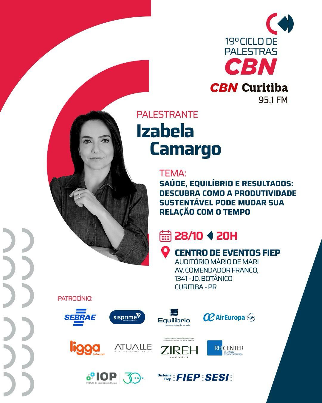 Palestra de encerramento do Ciclo CBN 2025 Para fechar com chave de ouro o Ciclo de Palestras CBN 2025, uma conversa inspiradora sobre como viver e produzir de forma mais equilibrada. A jornalista e escritora Izabella Camargo encerra esta edição com a palestra ?Saúde, equilíbrio e resultados: descubra como a Produtividade Sustentável pode mudar sua relação com o tempo.